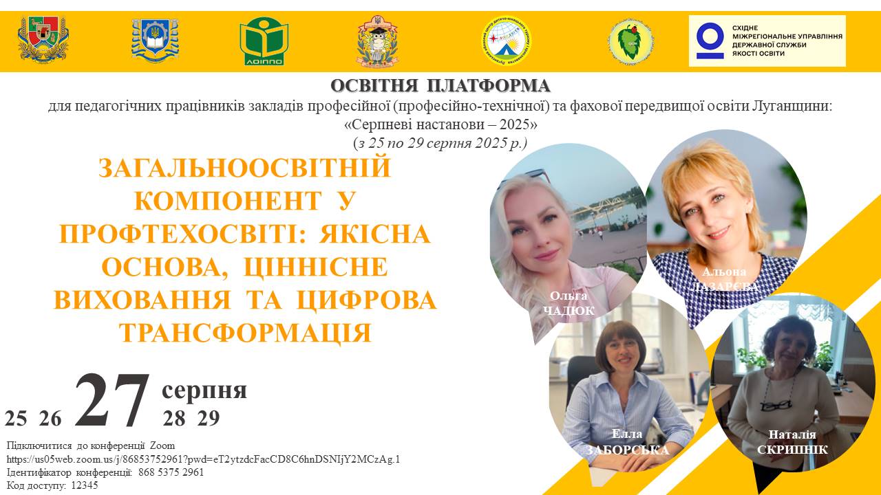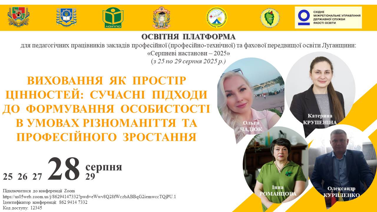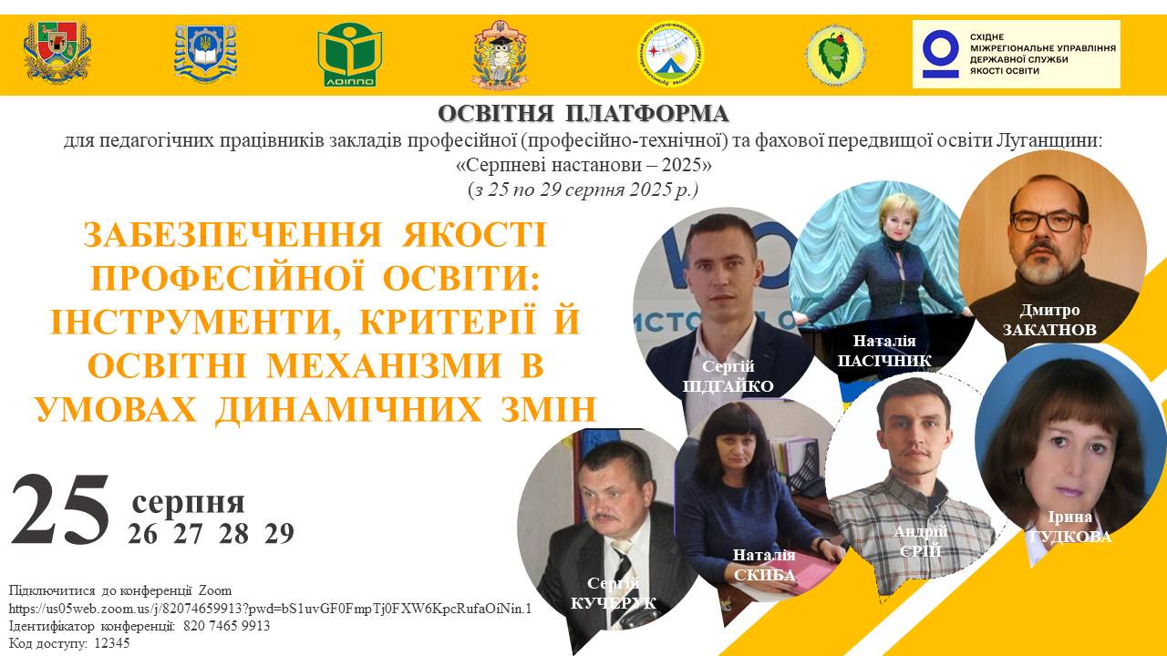 З 25 по 29 серпня 2025 року відбудеться ряд заходів в рамках роботи освітньої платформи для педагогічних працівників закладів професійної (професійно-технічної) та фахової передвищої освіти Луганської області «Серпневі настанови – 2025».