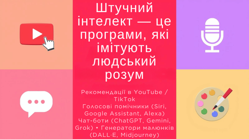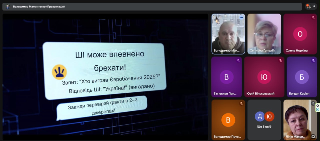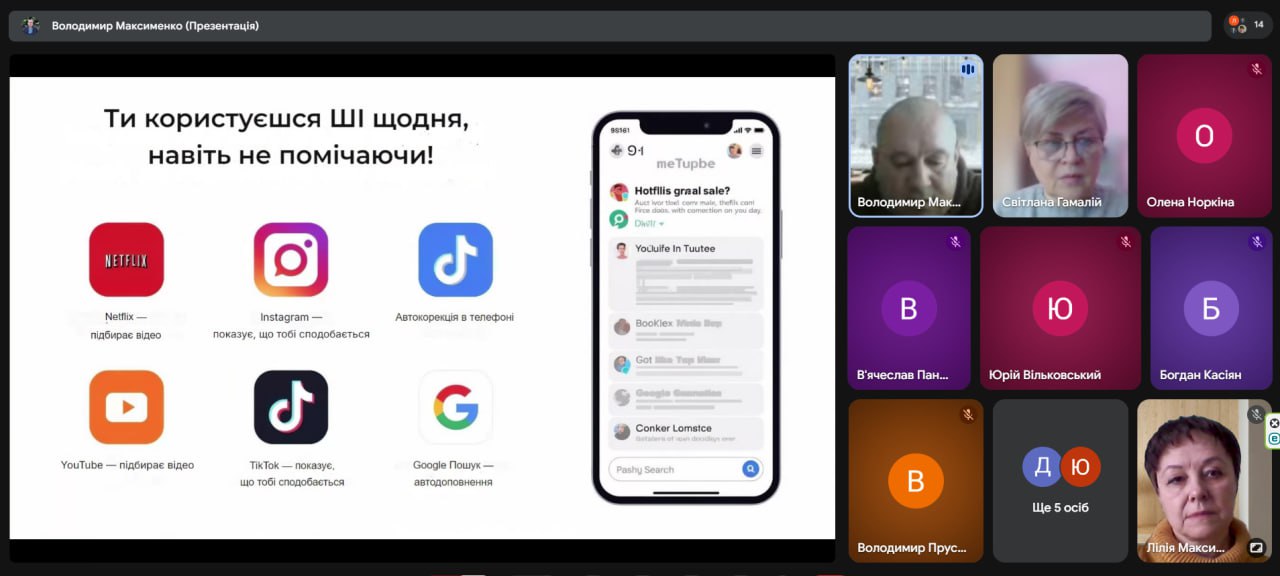 Викладач комп’ютерних дисциплін Максименко Володимир Геннадійович розпочав виступ із пояснення, що ШІ — це програми, які імітують людський розум. Ми користуємося цією технологією щодня, навіть не помічаючи цього: рекомендації в YouTube, TikTok, Netflix та Instagram; голосові помічники Siri та Google Assistant; автодоповнення в Google Пошуку та автокорекція в телефонах. Популярні чат-боти, такі як ChatGPT, Gemini чи Grok, та генератори малюнків уже стали частиною нашого життя.