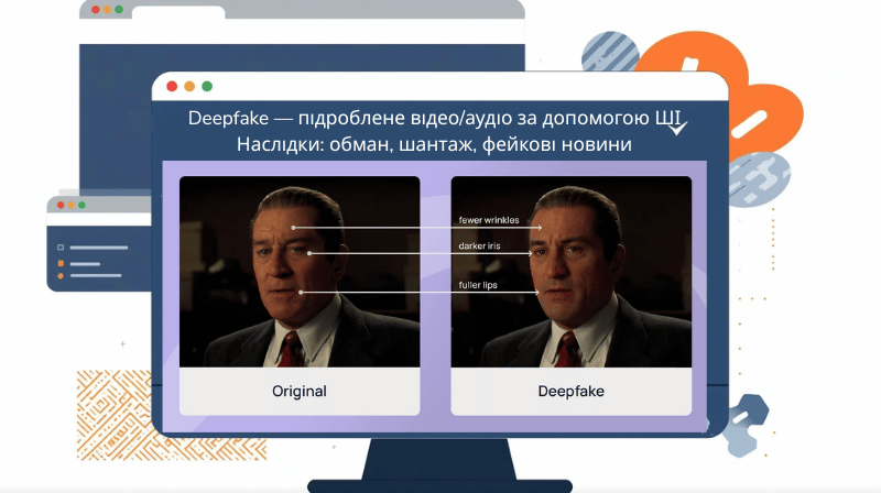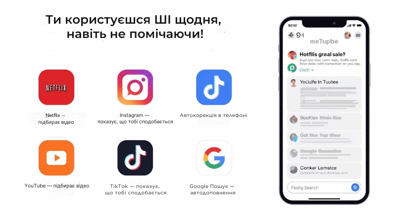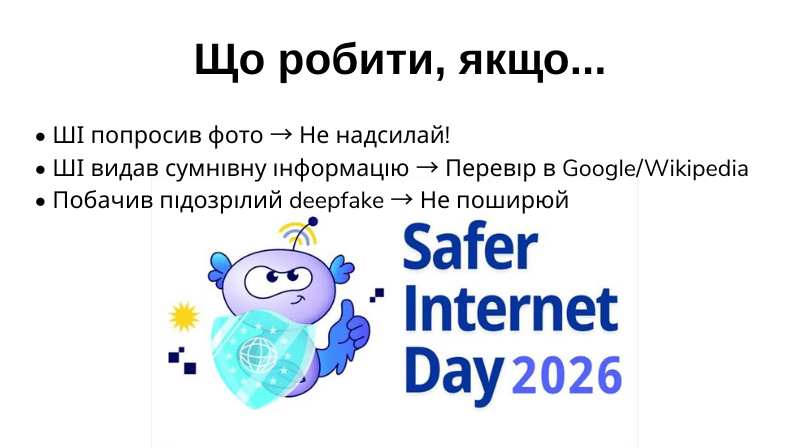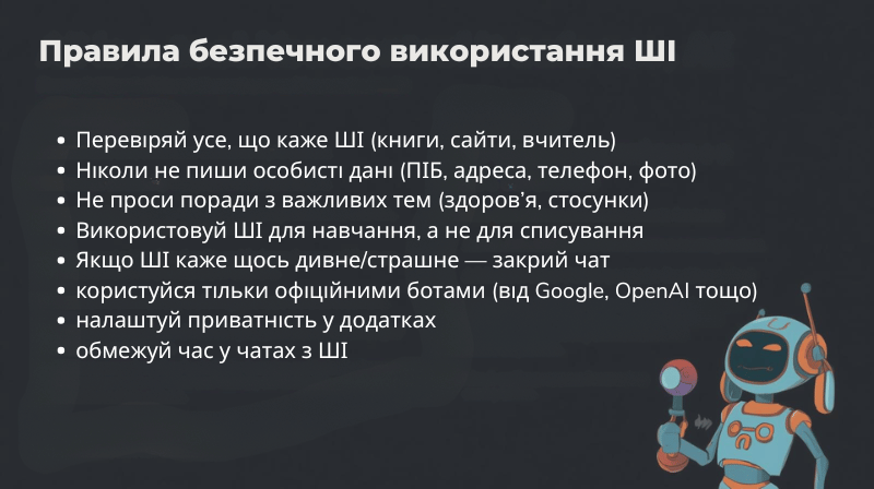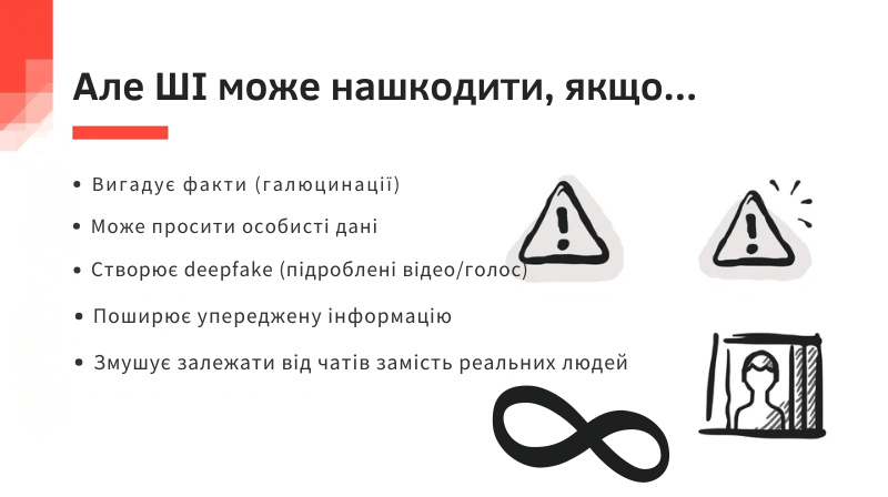 ШІ є надзвичайно корисним інструментом, якщо використовувати його з розумом. Він допомагає швидко шукати інформацію, перекладати тексти, планувати справи та генерувати творчі ідеї. Проте викладач застеріг про суттєві ризики: галюцинації (ШІ може вигадувати неіснуючі факти), Deepfake (створення підроблених відео чи аудіо для обману, шантажу або поширення фейків), порушення приватності (чат-боти можуть просити особисті дані), упередженість та залежність (поширення недостовірної інформації та ризик заміни реального спілкування віртуальним).