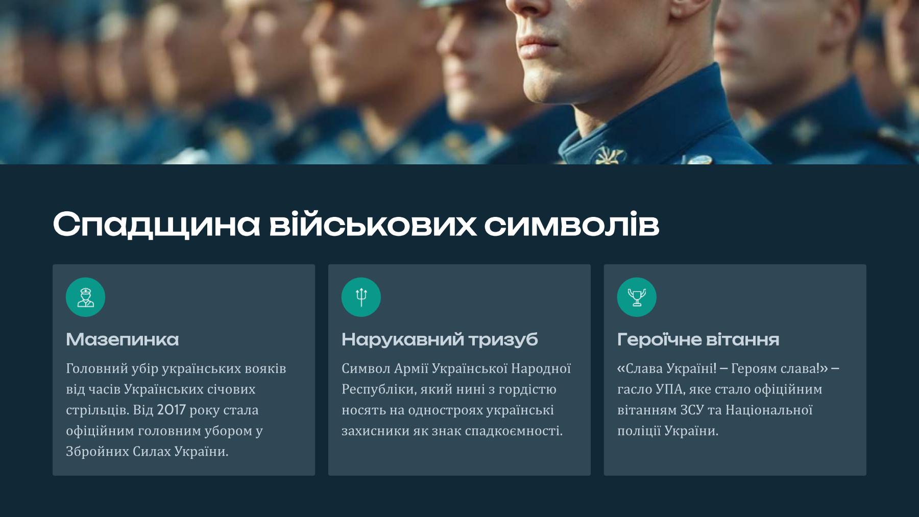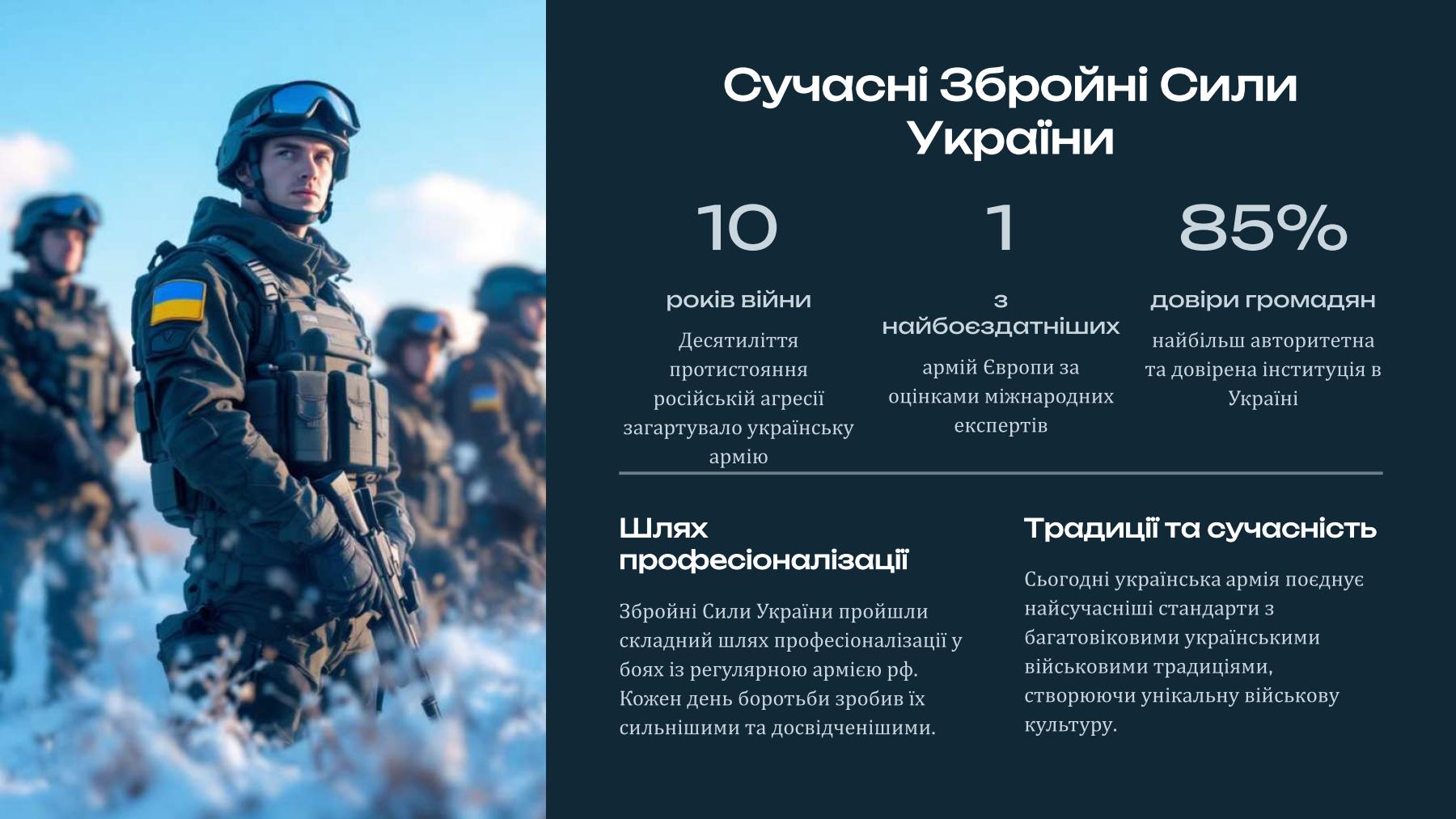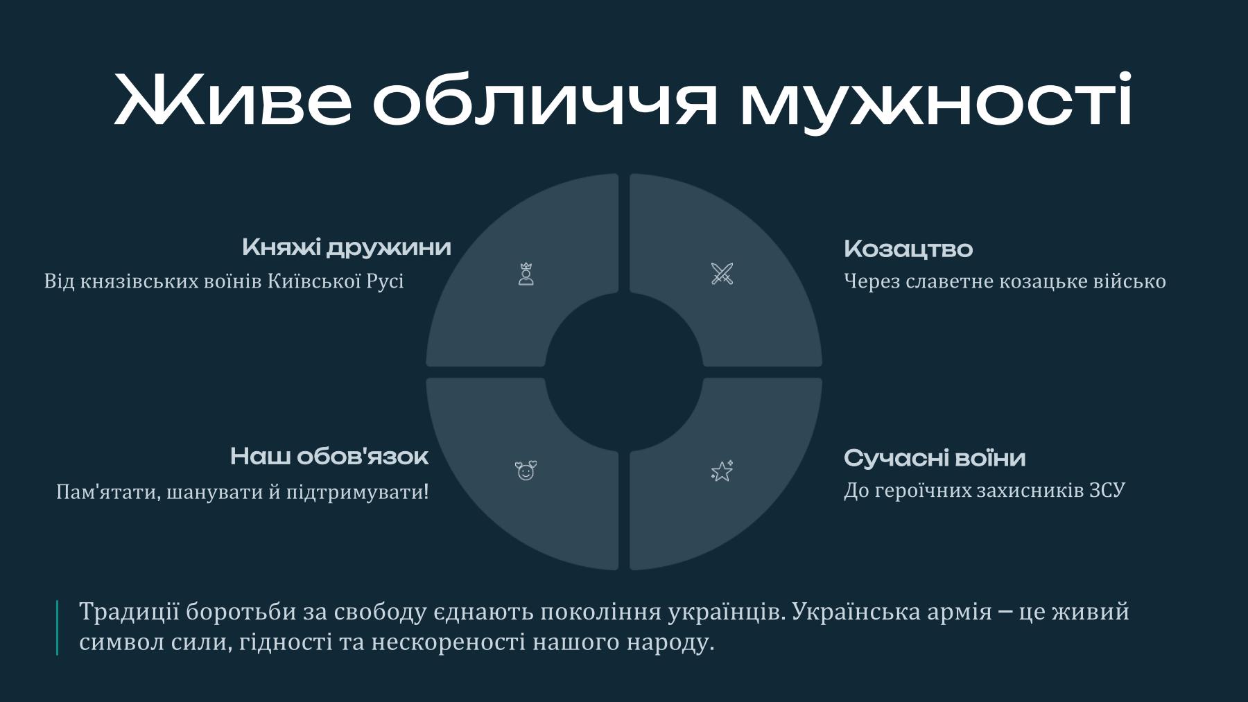 Українська армія продовжує славетні військові традиції нашого народу: від давніх воїнів-русичів і козаків – до січових стрільців та вояків УПА. Сьогоднішні воїни гідно наслідують героїв минулих епох і пишуть нову історію нашої держави.