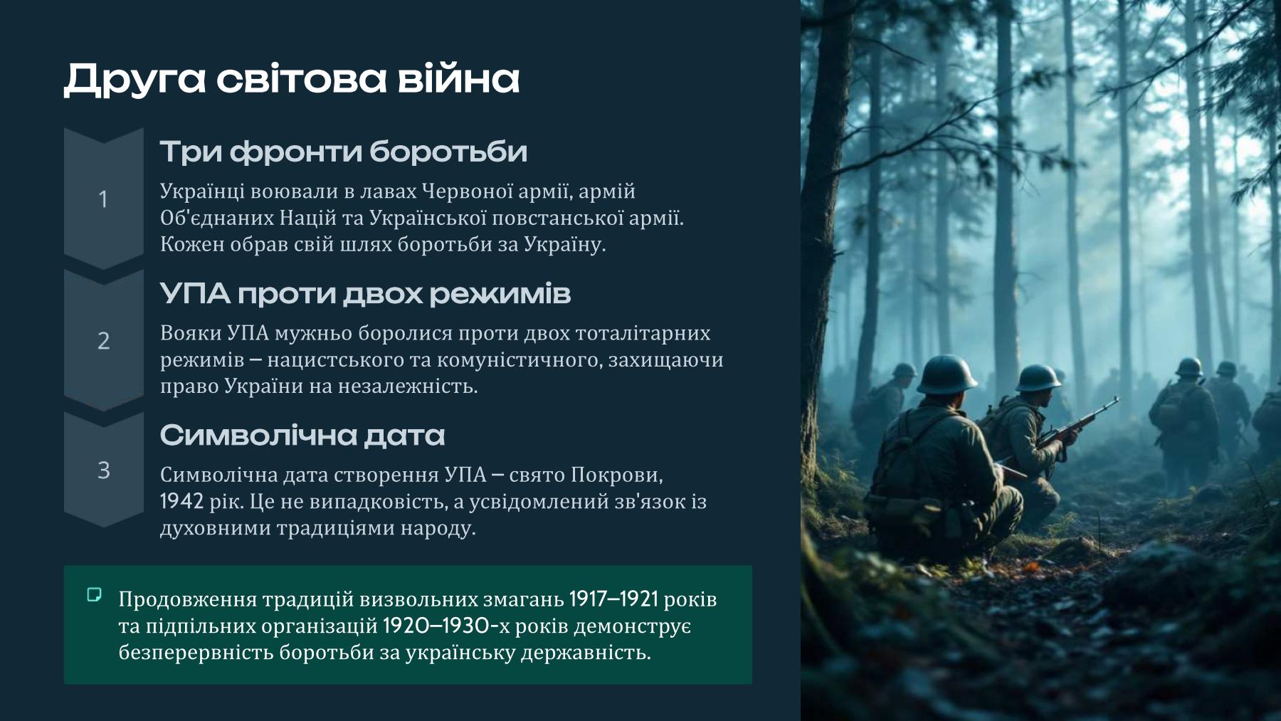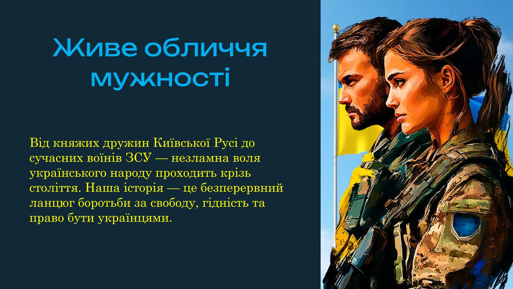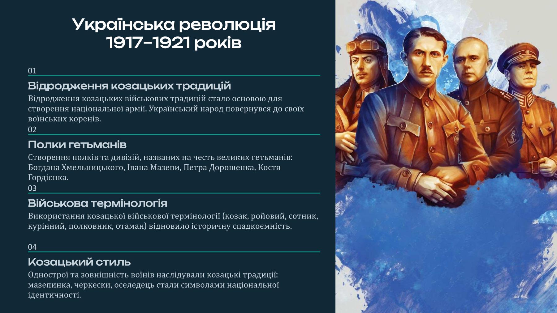Українська армія продовжує славетні військові традиції нашого народу: від давніх воїнів-русичів і козаків – до січових стрільців та вояків УПА. Сьогоднішні воїни гідно наслідують героїв минулих епох і пишуть нову історію нашої держави.