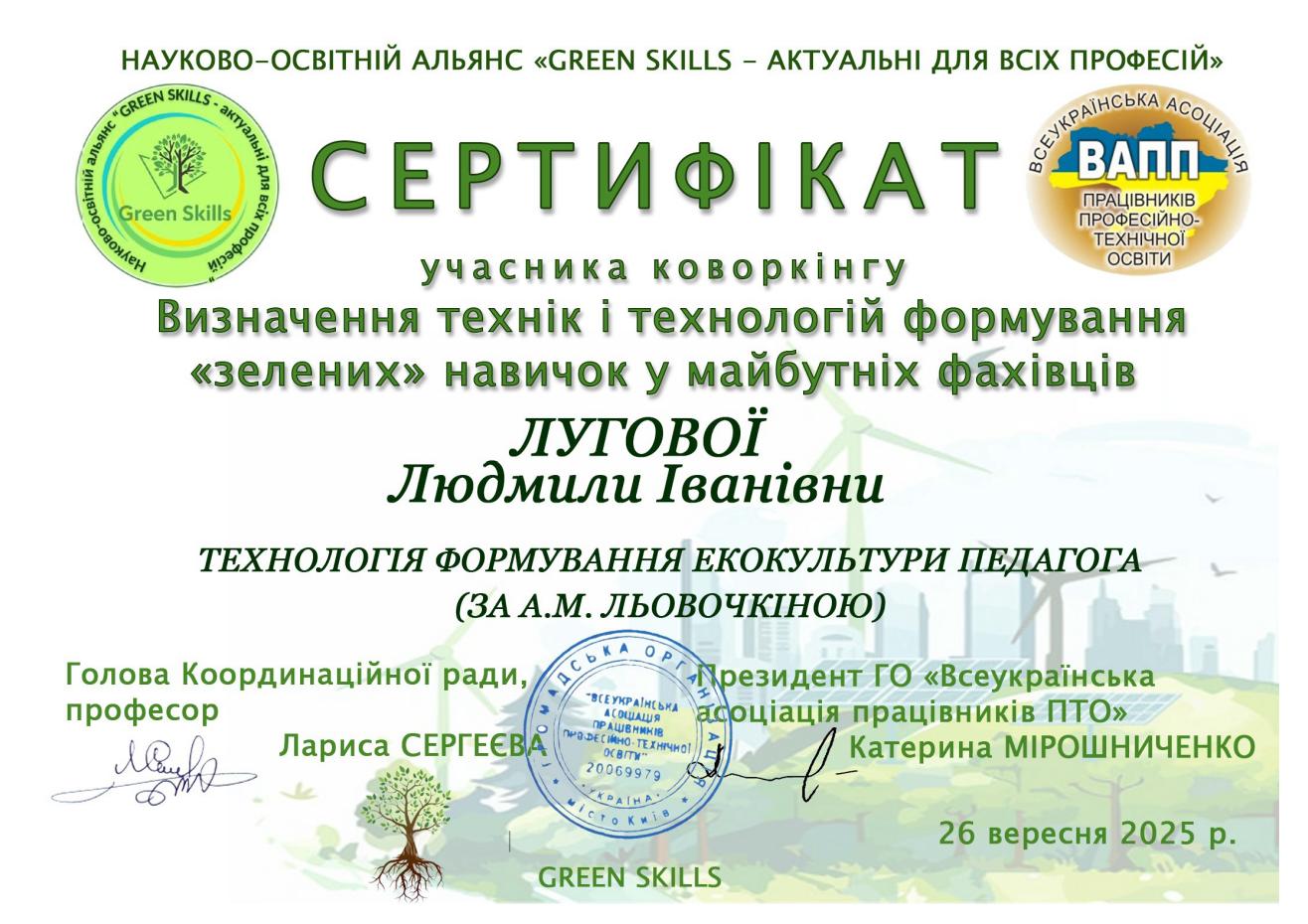 26 вересня 2025 року у рамках прикладного наукового дослідження «Формування зелених навичок (green skills) в освітньому середовищі закладу освіти» (куратор-тьютор професор Сергеєва Лариса Миколаївна) відбувся коворкінг на тему «Визначення технік і технологій формування “зелених” навичок майбутніх фахівців».