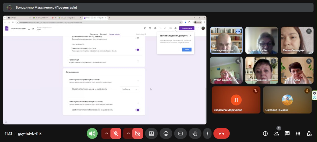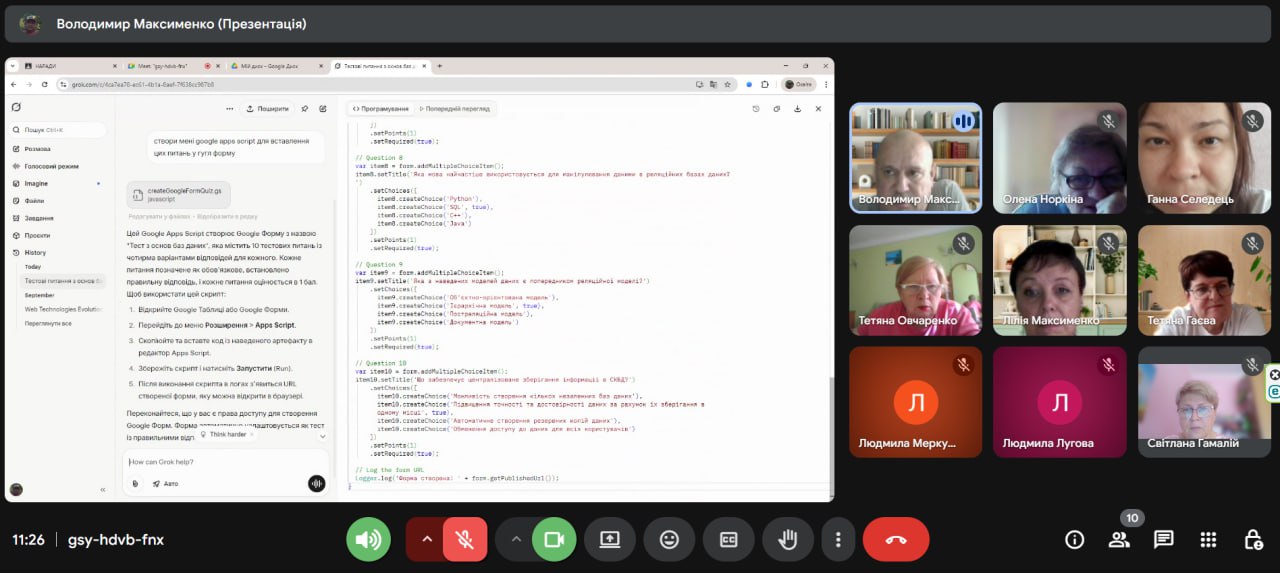 Під час заходу викладач комп’ютерних дисциплін Максименко Володимир Геннадійович поділився досвідом використання можливостей Google Форм для автоматизації освітнього процесу. Зокрема, він продемонстрував, як за допомогою Google Apps Script можна підключати скрипти до форми, створювати тестові завдання та збирати аналітичні дані для подальшого аналізу результатів навчання.