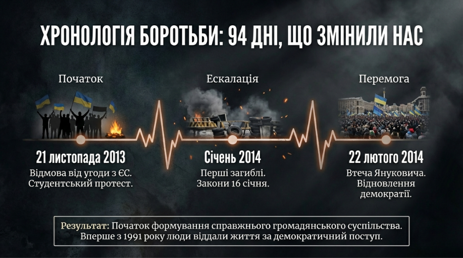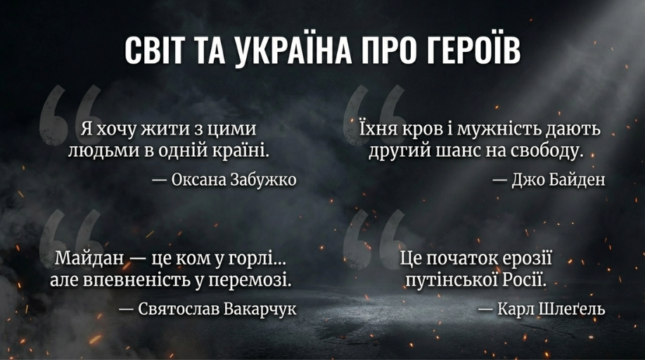 Подвиг Небесної Сотні став моральною межею, після якої вже неможливо було повернутися до страху й покори. Їхня жертовність змінила хід історії, утвердила право українців самим визначати майбутнє своєї держави й показала світові силу громадянської солідарності.