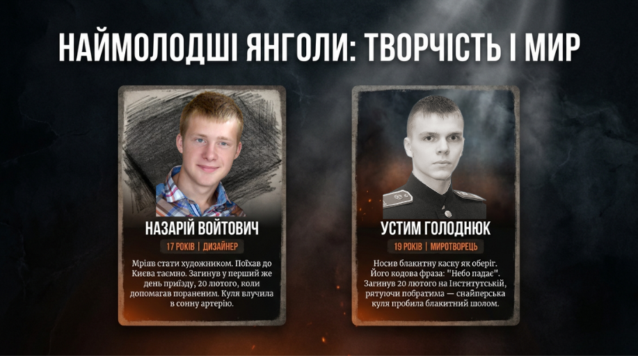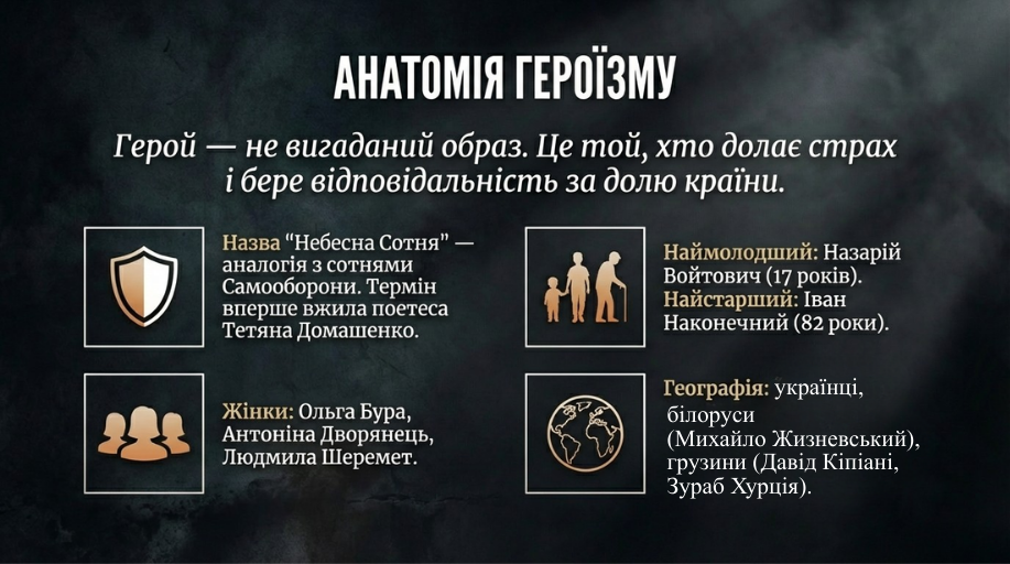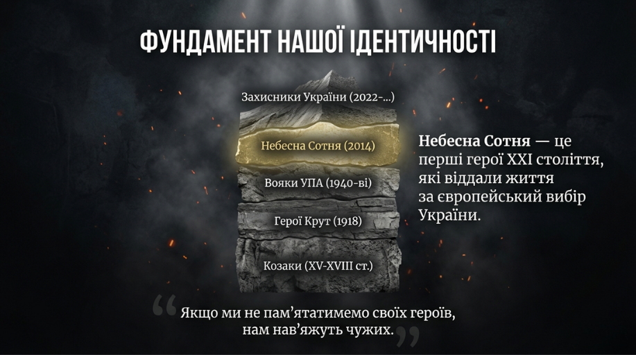 Небесна Сотня — це студенти й викладачі, робітники й підприємці, митці й інженери. Це люди різного віку, професій та регіонів, яких об’єднало одне — прагнення свободи. Вони вийшли на Майдан, щоб захистити гідність, і заплатили найвищу ціну. Їхня жертва — це не лише біль, а й відповідальність для кожного з нас: берегти здобуту свободу та продовжувати боротьбу за справедливість.