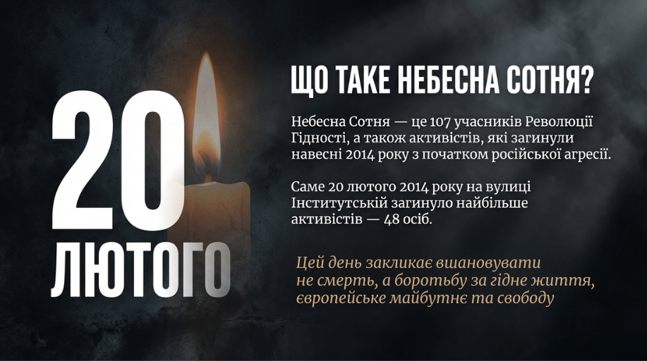 20 лютого — дата, яка навіки вписана у новітню історію України. Це день пам’яті Героїв Небесної Сотні — тих, хто віддав своє життя за право українців жити у вільній, демократичній державі. Їхній подвиг став символом незламності та моральної сили народу, який не погодився на приниження та несправедливість.