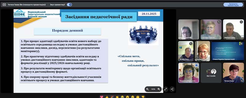 28 листопада 2025 року в Первомайському індустріально‑педагогічному фаховому коледжі відбулося чергове засідання педагогічної ради. В заході взяли участь усіх членів ради, а також голова Ради студентського самоврядування Міщенко А.