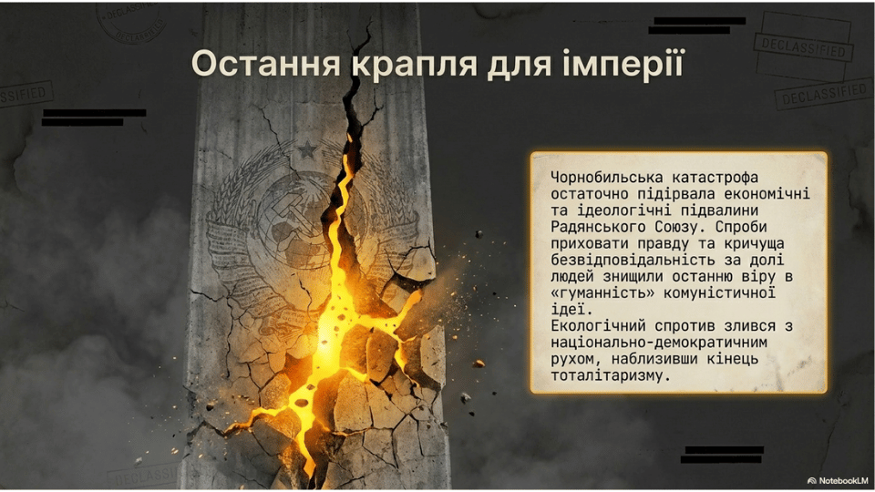 Чорнобильська трагедія мала не лише екологічні та медичні, а й глибокі соціально-політичні наслідки. Вона оголила системні проблеми тоталітарного управління, зокрема нехтування безпекою людей і правом суспільства на правдиву інформацію. Саме після цих подій активізувалися екологічні та громадянські рухи, що згодом стали частиною ширших процесів суспільних змін.