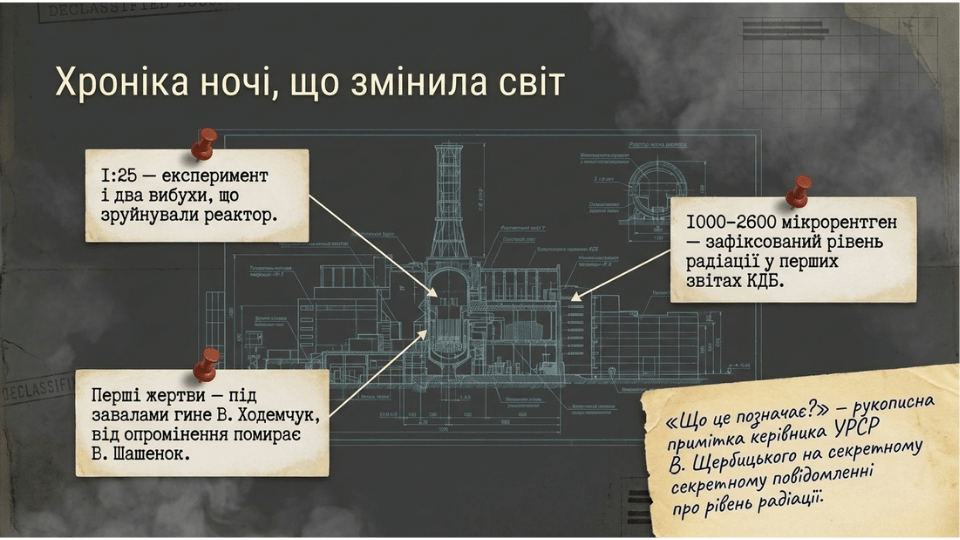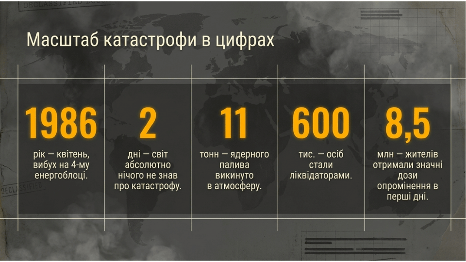 У ніч на 26 квітня 1986 року під час експерименту на четвертому енергоблоці Чорнобильської атомної електростанції сталися вибухи, що призвели до руйнування реактора. В атмосферу потрапили тонни радіоактивних речовин, які вітром були рознесені на значні території Європи. Радіаційного впливу зазнали мільйони людей, а сотні тисяч були змушені залишити свої домівки.