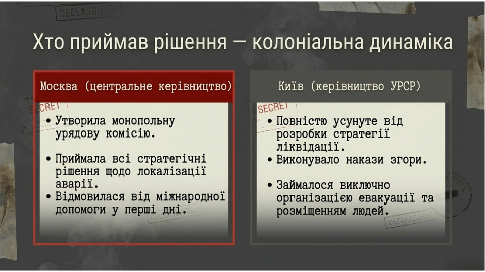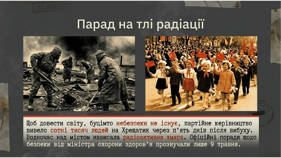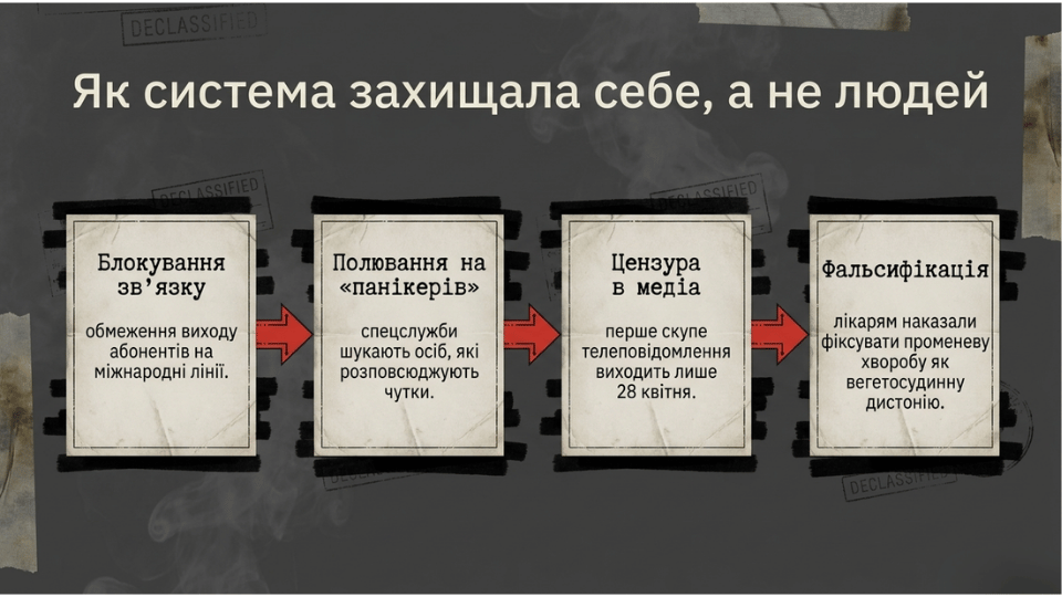 Однією з найболючіших сторінок трагедії стало запізніле інформування населення. Евакуація мешканців міста Прип’ять розпочалася лише через понад добу після аварії, а перші офіційні повідомлення були вкрай обмеженими. Замовчування реальних масштабів катастрофи призвело до додаткових ризиків для здоров’я людей і підірвало довіру до влади.