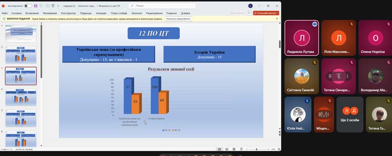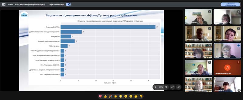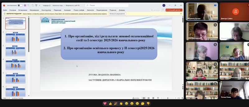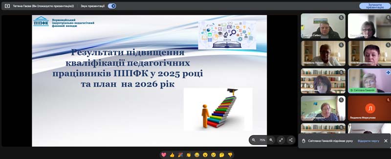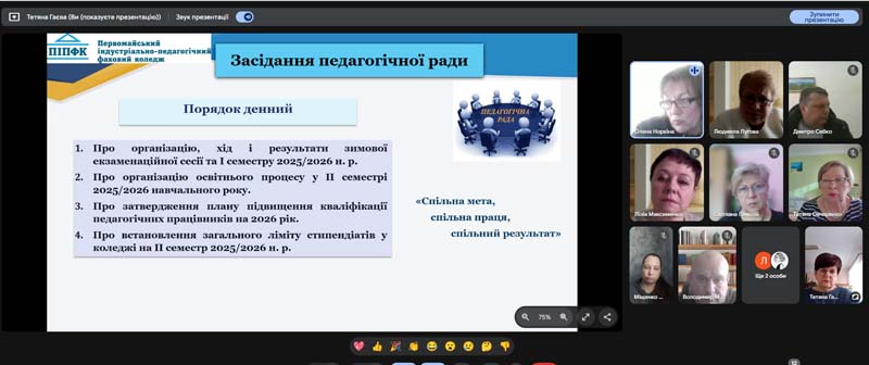Під час зустрічі, що проходила у режимі відеоконференції, колектив обговорив питання професійного вдосконалення викладачів. Особливу увагу приділили змінам у законодавстві, зокрема постанові Кабінету міністрів України від 22.10.2025№ 1343, яка з липня 2026 року оновить вимоги до програм підвищення кваліфікації та розширить переліки його форм, включаючи визнання супервізії.