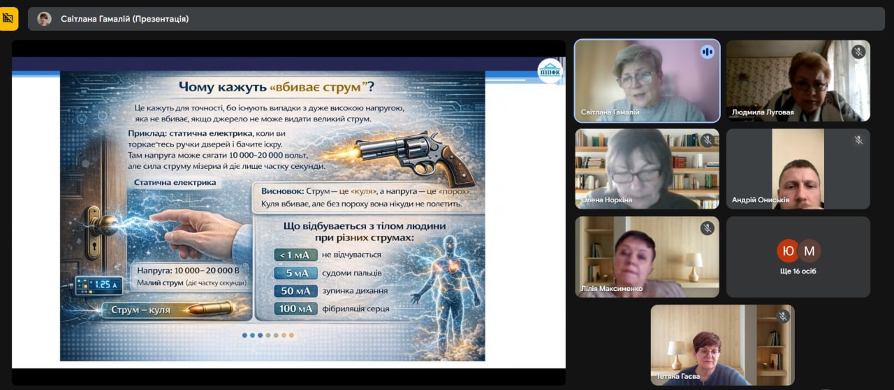 Плавним переходом до нової теми стала творча вправа «Асоціації», де через візуальні образи студенти аналізували роль електричного струму в сучасному світі. Пояснення нового матеріалу супроводжувалося мультимедійною презентацією, адаптованою до фахового спрямування майбутніх майстрів виробничого навчання, спеціалізацією яких є цифрові технології.