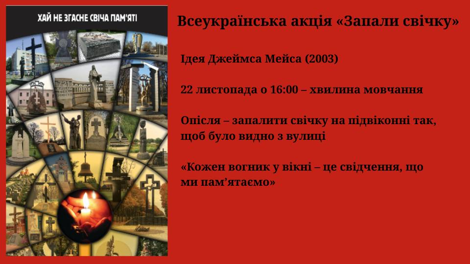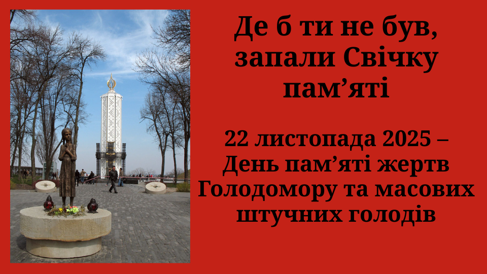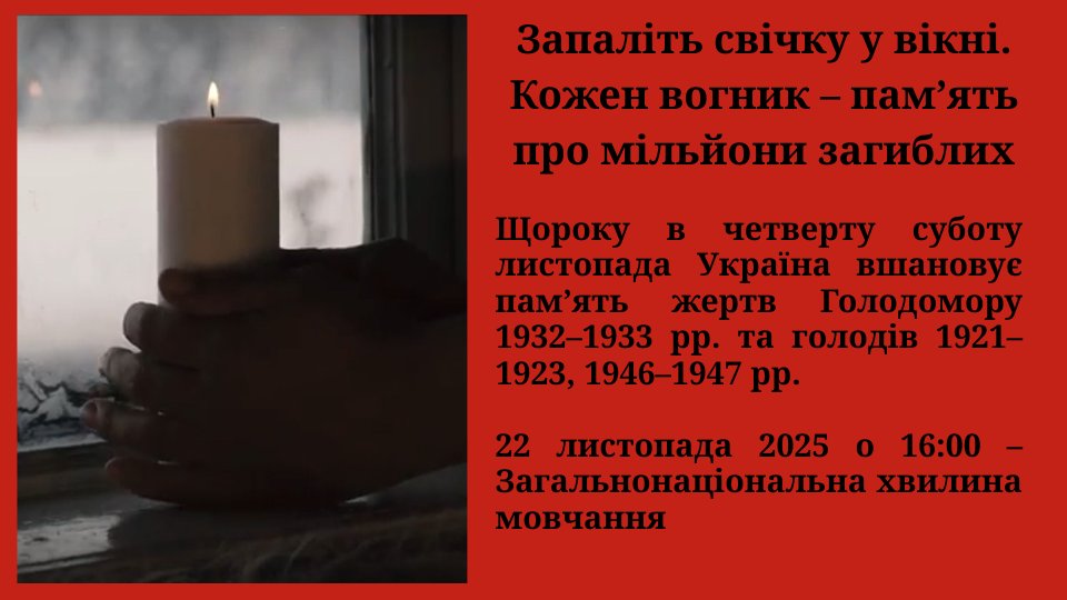 Вшанування пам’яті жертв Голодомору цього року проходить під гаслом «Де б ти не був, запали Свічку пам’яті». 22 листопада о 16:00 українці в усьому світі долучаться до Загальнонаціональної хвилини мовчання, щоб згадати мільйони життів, обірваних сталінським режимом, і засвідчити: ми пам’ятаємо, ми єднаємося, ми знову вистоїмо.