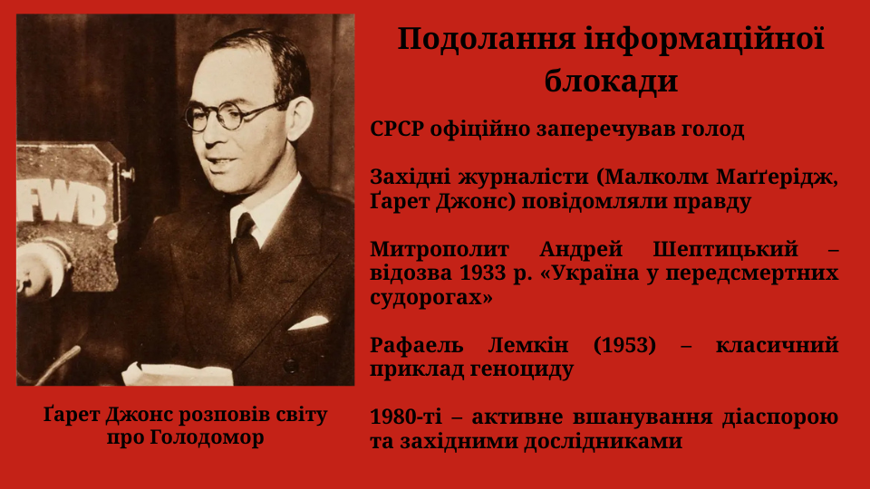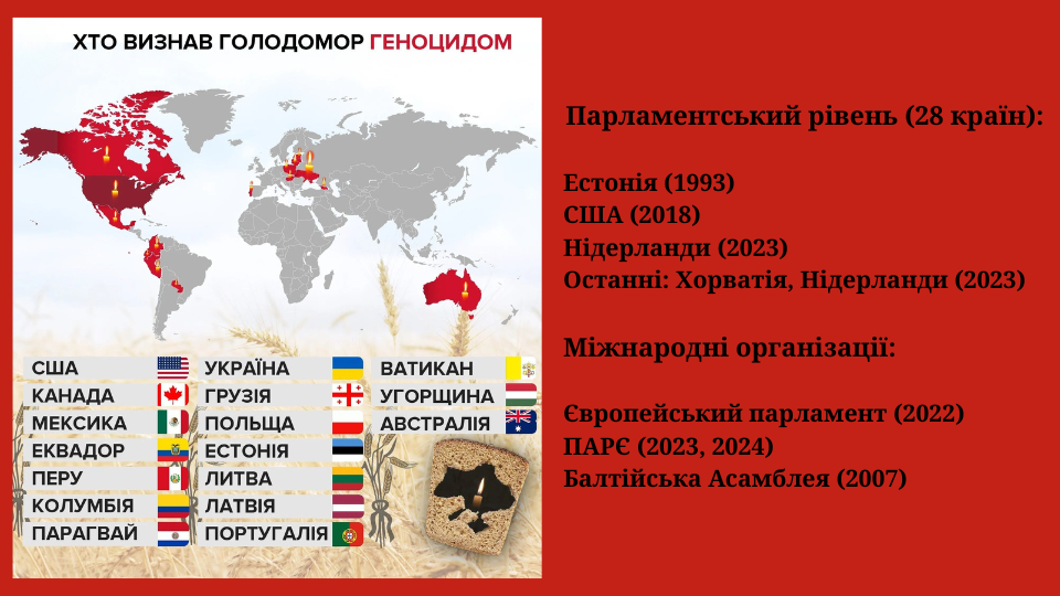 Тривалий час радянська влада замовчувала злочин, знищувала документи, переслідувала тих, хто намагався говорити правду. Проте завдяки дослідникам, свідкам і небайдужим українцям та іноземцям правда про геноцид стала відомою всьому світові. Сьогодні Голодомор визнаний актом геноциду Українського народу в Україні та в десятках інших країн і міжнародних організацій.