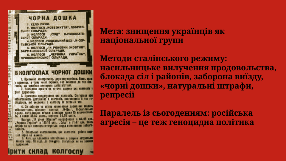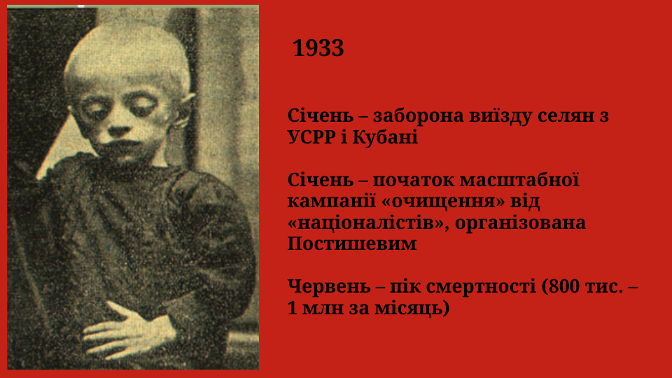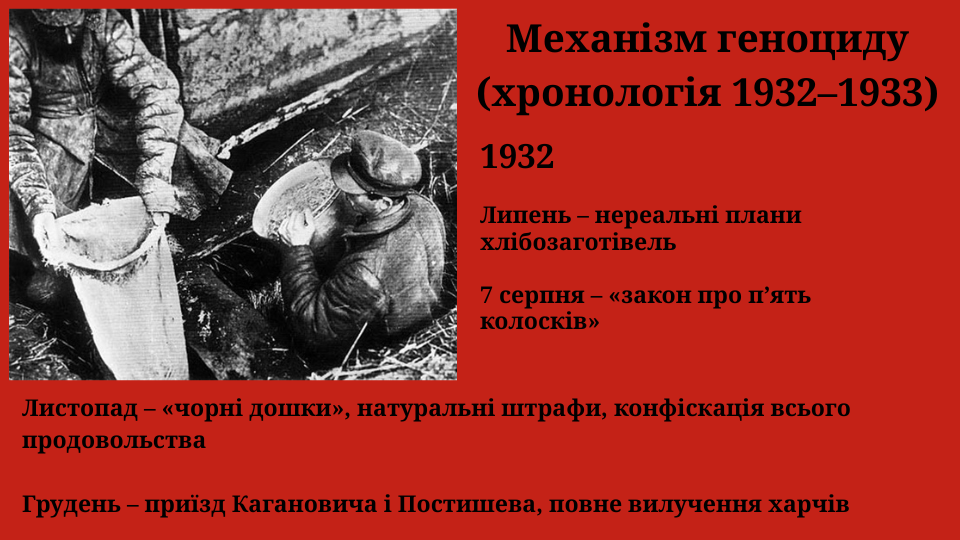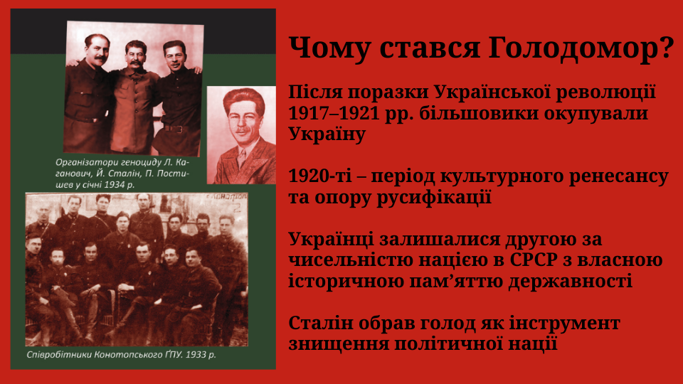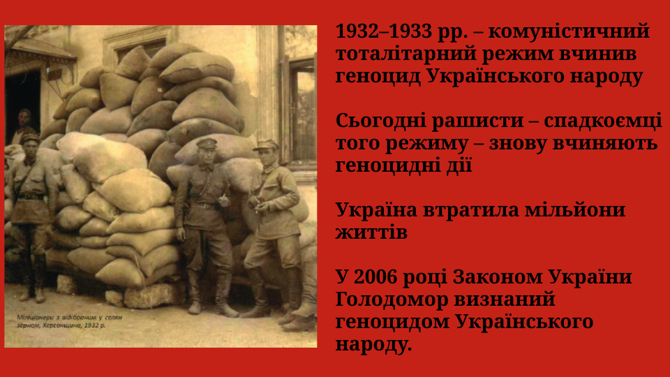 Голодомор 1932–1933 років – це злочин геноциду, навмисно організований комуністичним тоталітарним режимом проти українського народу. Метою Сталіна та його оточення було знищення української нації як політичної та культурної спільноти. Через насильницькі хлібозаготівлі, конфіскацію всіх харчів, блокаду сіл, заборону виїзду та масові репресії були створені умови, несумісні з життям. Саме в ті кілька місяців 1932–1933 років Україна втратила мільйони своїх громадян – дітей, жінок, чоловіків, цілих родин і громад.