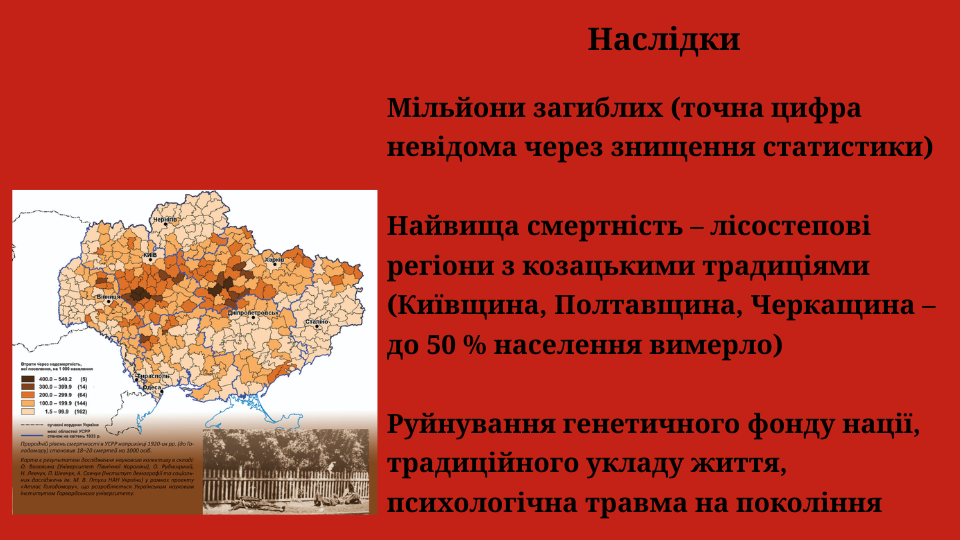Найбільше від голоду постраждали центральні регіони України з глибокими козацькими традиціями – Полтавщина, Черкащина, Кіровоградщина, Київщина. У низці районів упродовж одного 1933 року загинуло понад половину населення. Голодомор став не лише фізичним ударом по нації, а й спричинив довготривалі моральні та психологічні травми, руйнування традиційного укладу життя.